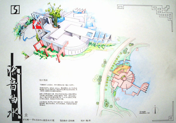 李诗芸同学的作品《金儒羽文化传播公司标志设计》包涵了两种作品类别。在进行招贴广告设计时,李诗芸将东巴纸凹凸不平的质感以及东巴文字表现于人脸上,旨在表达纳西族深厚的民族文化。在为该公司进行标志设计时,李诗芸则突出了“GOLD”的开头字母大写G的圆润身形,因为“G”是中文沟通“沟”拼音声母,以此强调该公司作为商户和学生之间交流平台的定位。李良同学则希望通过自己的插画设计作品《生活》将记忆中的趣事保存下来。陈灵波、刘洋合作的插画设计作品《朋克青年》则用当下比较流行的卡通造型和装饰元素来表现画中人物的主 要性格。韩洋的作品《流音曲水——学生活动中心建筑设计》主题为“流音曲水”,取自晋代王羲之《兰亭序》:流觞曲水,列坐其次。造型中以音符为基本元素,与线条相互交织,让人感受到五线谱上流动的音符,便是“流音”。水由室外引入室内,然后横穿整个建筑,明确了设计主题:“曲水”。音在水中流,水在音中曲。
