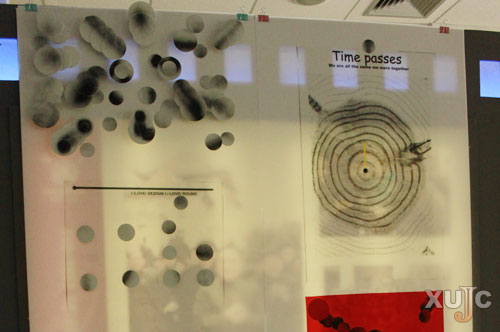 在一个展点前,记者发现一个男生正在认真地将一只掉下来的脸谱贴回原位。上前询问才知道,原来那不是他自己的作品,他只是看到同学的作品掉下来好心帮忙而已。对于这样一个“好心人”,记者忽然很好奇他会创作出怎样的作品。于是,这个叫杨聪的男生将记者带到了一组全是由圆圈构成的海报面前。“这是我的毕业设计,‘关于圆圈的联想’,圆好像一个起点,又像一个终点。我用一圈又一圈的圆来营造一种空间感。”