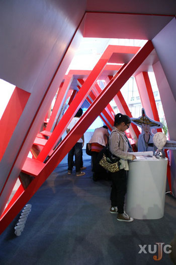 展览刚刚开始,厦门大学展位前便聚满了参观的游客,尤其是我院艺术设计系为展示水墨动漫连续剧《保生大帝》搭建的“小棚子”更是吸引了许多游客。展区整体为朱红色,以三角形为主体骨架,依次排列成流动的S型。三角形展馆外的展台上摆放的特制白色瓷杯也装满了水,与山相依,这寓意着闽台两地山水相依,一衣带水。《保生大帝》在这个空间中全天循环播放,受到了来往专家、展商、游客的一致认可与好评。