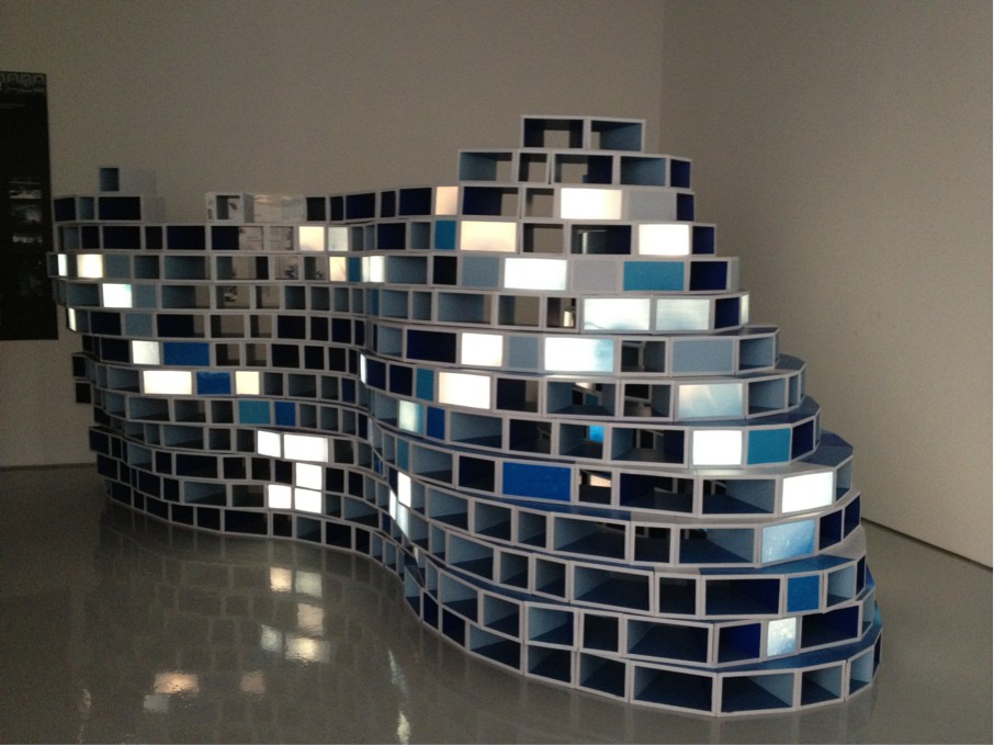 最后一组作品则围绕水“流动性”采用简单的几何体堆叠与排列的形式,向参观者展现水与光的结合。环境科学与工程系10届校友张琳婷说:“这组作品色调搭配得不错,艺术设计系同学设计的作品一向都很棒,美术馆更是充满了艺术气息。”
