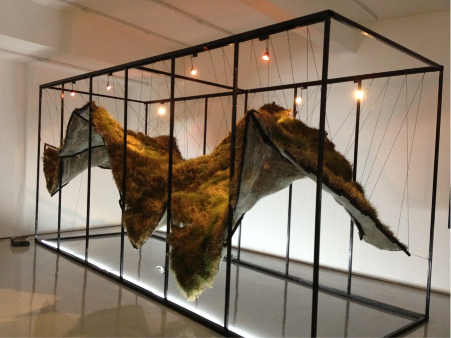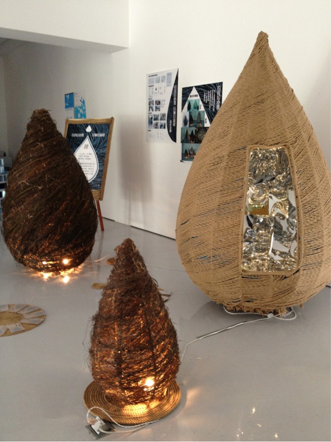 一进美术馆大门,便可以看见第一组作品。这组作品用镜面反射的方式具象地表现了水的形式。动和静相辅相成,在视觉和感官上都给人焕然一新的感觉。这组作品旁边则是第二组作品“涟漪”。它采用玻璃钢为主要材料,用一定的工艺做出仿石的效果,还在“石块”表面刻上荡漾开或者碰撞在一起的波纹。在第三组的作品中,同学们将藤条、麻绳、柳条盘旋向上缠绕在“水滴”上,将流动、富有生命力的“水滴”淋漓尽致地表现了出来。而第四组“绿意婉转”则采用扭转思维,提取草坪真实的质感和色调,结合水动感的曲线,营造了一种腾空的水波环绕在周围的意境。