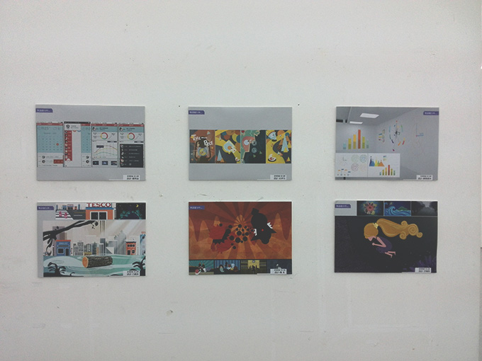 一走进展馆,首先看到的是正对展厅的门上悬挂的巨大幕布,上面一一介绍了数字媒体的专业背景以及从数码媒体更名为数字媒体的缘由。