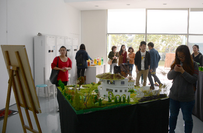 馆内共展出了10件12级景观艺术专业同学的模型作品。每一件作品都是由多名同学组队通过几个星期的努力共同搭建完成。从设计到制作,每一个步骤都经过详细而又精密的计算制作而成,最终呈现出《礼物》、《“树”工作室》、《嘉苑》等优秀作品。