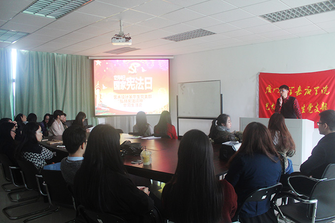 今年12月4日是我国首个“国家宪法日”,为贯彻落实党的十八届四中全会精神,在学生党员中弘扬宪法精神,树立法治意识,艺术设计系学生党支部于12月4日中午在人文A504召开“弘扬宪法精神”学习生活会。生活会由学生党支部书记赵祥主持,系党建指导老师郑文钰莅临现场并参与学习讨论,