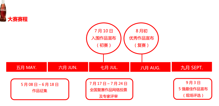 在可口可乐弧形瓶诞生100周年之际,它的传奇历史中也将留下你的足迹——此次设计大赛将有25件优秀参赛作品脱颖而出,并于9月初在上海举办的“可口可乐弧 形瓶艺术之旅:启迪流行文化100年”全球巡回艺术展中与波普艺术大师安迪•沃霍尔(Andy Warhol)、诺曼•洛克威尔(Norman Rockwell)以及克里夫•巴克(Clive Barker)等艺术大师的作品共同展出。在巡回艺术展的现场评选中,最终获胜的5件佳作将由美国亚特兰大可口可乐博物馆永久收藏。听到这里,你是否已经摩拳擦掌,准备用自己非凡的创意向经典致敬? 那就快来了解比赛详情吧!
