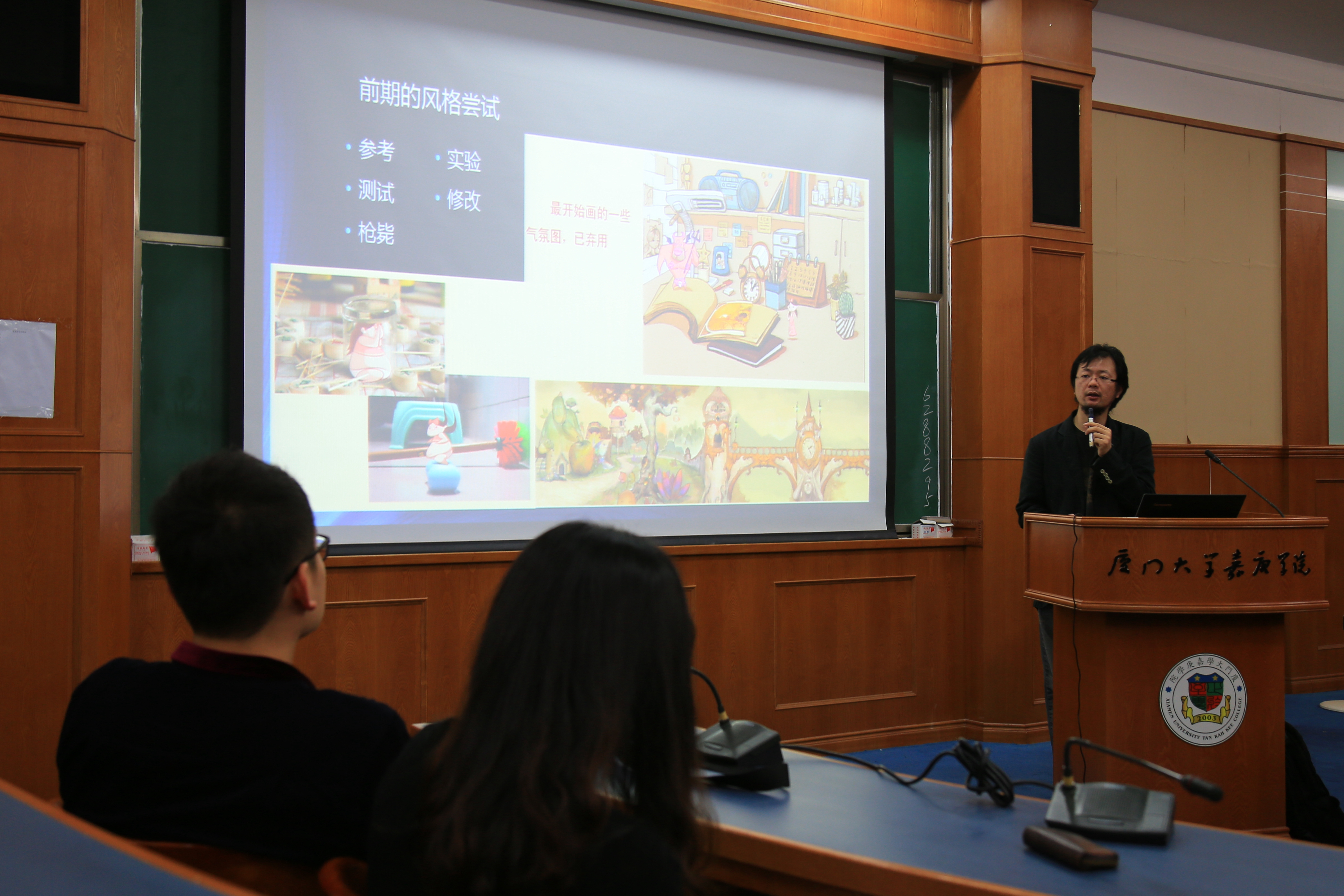 讲座主要分享这个学术团队在培养动画人才、争创优秀作品、勇斩国际奖项的心路历程和实战经验。现场,陈赞蔚主任通过ppt为我们讲解了整个作品创作的思路,强调剪影在视觉上的冲击力最强,随后分别从概设,氛围,叙事草图阶段进行讲解,为我们提供了手绘草图的逐步深入的方法与过程,从开始如何构思整张草图,到每个方案的改善,深入和细节的表达,都进行了详细的讲解。同时鼓励在场老师同学提问,解答同学们心中的疑惑。陈赞蔚老师着重强调的一点就是草图绘制过程中思考的重要性,要让别人清楚地明白设计师的想法,画出自己想做的形象的角色,多画,再思考,然后再画角色在剧里表演的角色,再画细节。