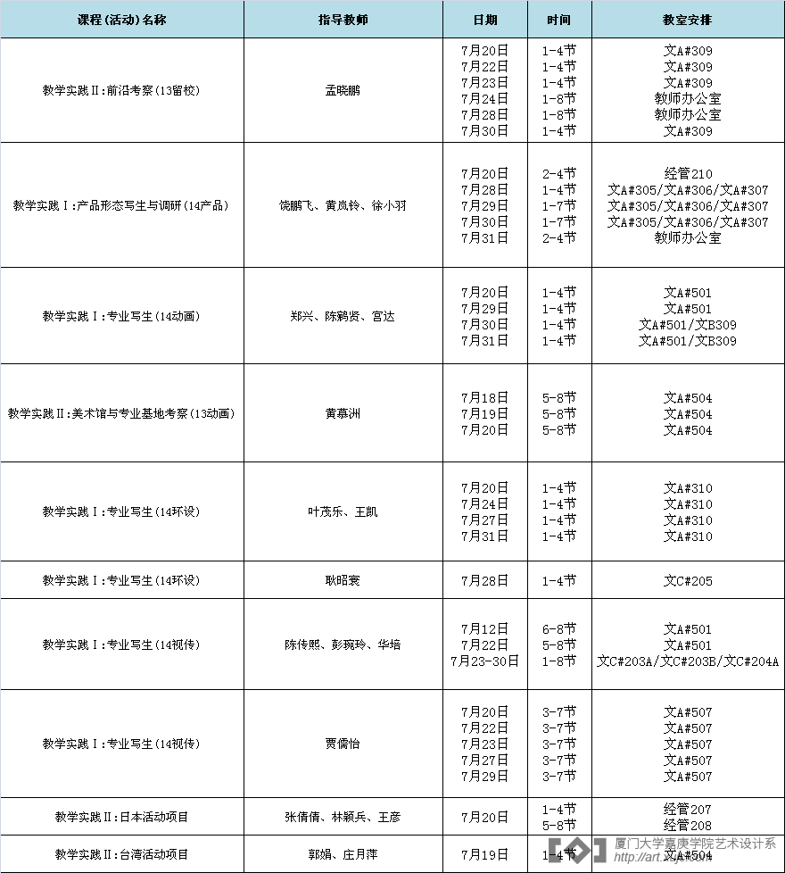 14-15(2)学期艺术设计系实践教学周部分活动项目需使用教室,现将教室安排公布如下。其余未安排教室的,请按照指导教师通知准时参加活动。如有临时调整,一切以指导教师临时通知为准,请注意互相转告提醒。