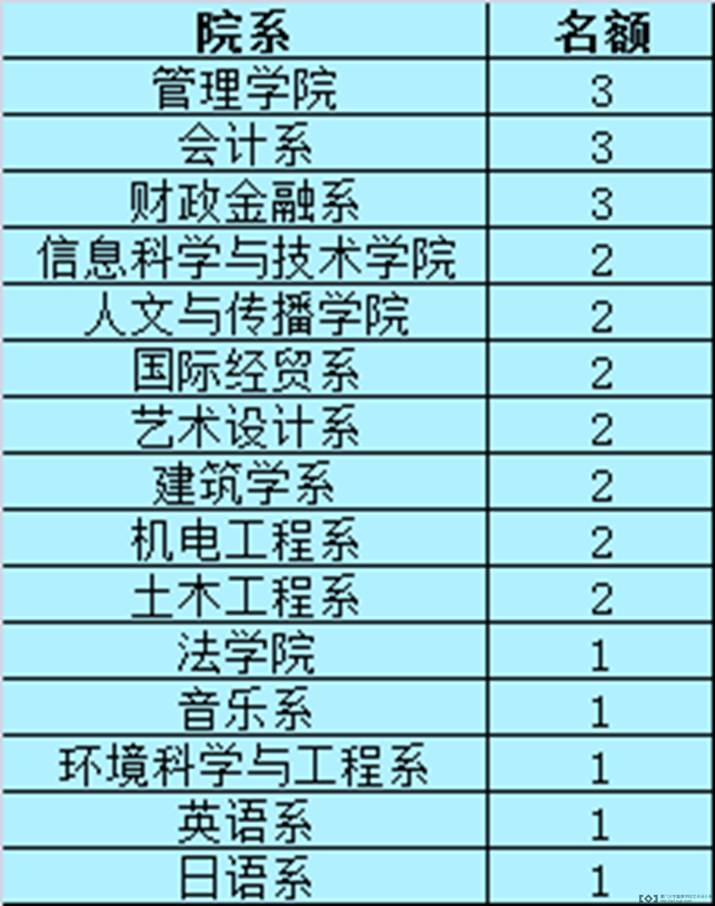 国家奖学金的评选对象均为在校生二年级以上(含二年级)的学生,按一学年发放,每人每年奖金8000元。我校今年国家奖学金的名额共计28个,按照各院系人数分配结果如下: