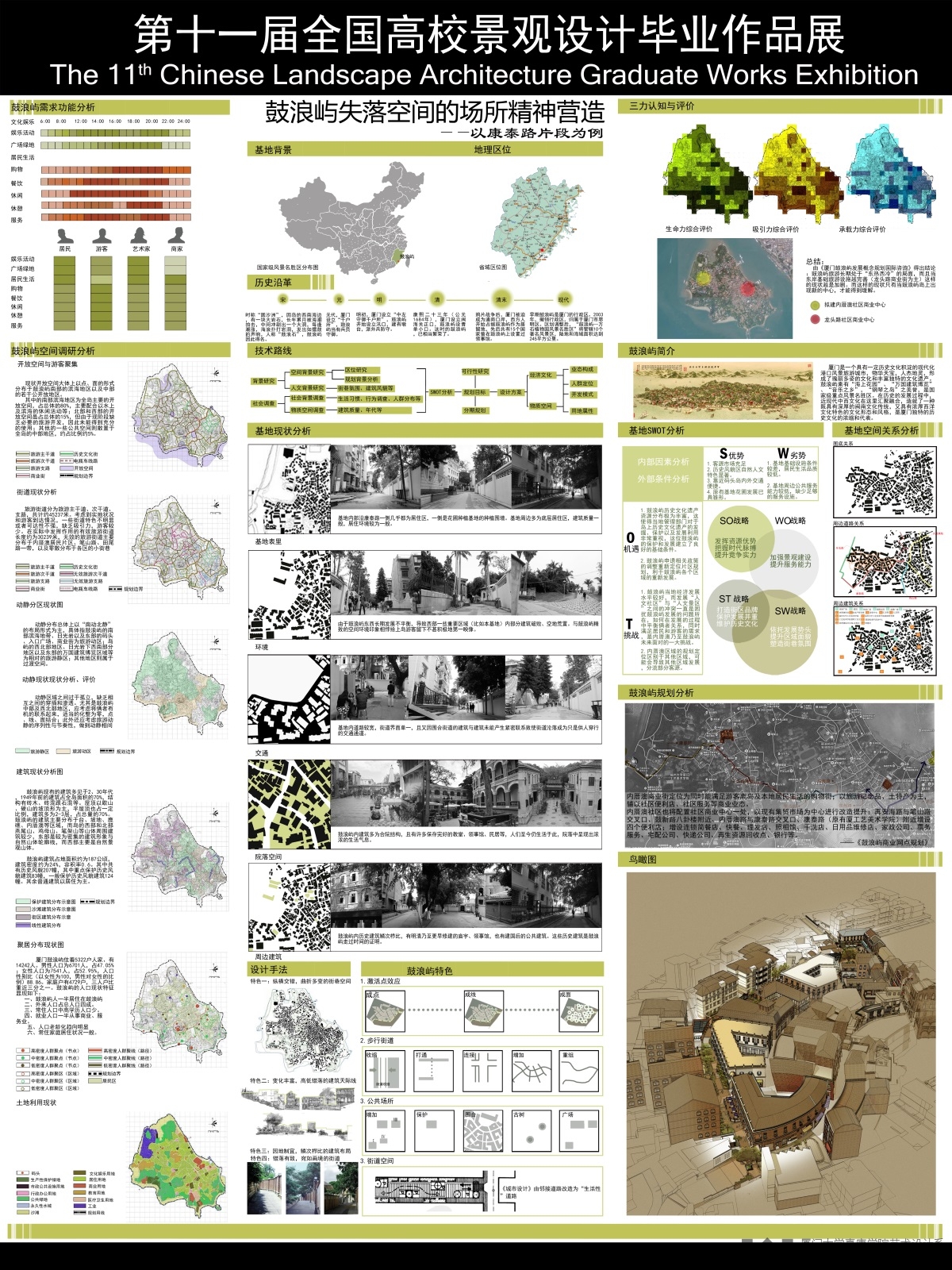 鼓浪屿东岸及龙头路由于地理位置及历史因素使然,使得它一直扮演着鼓浪屿的“心脏”作用。随着近年厦门旅游行业升温,此“心脏”早已超出它所能承载的极限。发展鼓浪屿的当务之急应是创造第二个“心脏”。本设计方案就旨在创建鼓浪屿的第二个“心脏”,营造“逛而不走”的空间环境以达到为龙头路分流的目的。本方案将街区规划和康泰路片区环境改造相结合,挖掘鼓浪屿的深层次文化以营造富有地域性、文化性和生活型的外部空间环境。
