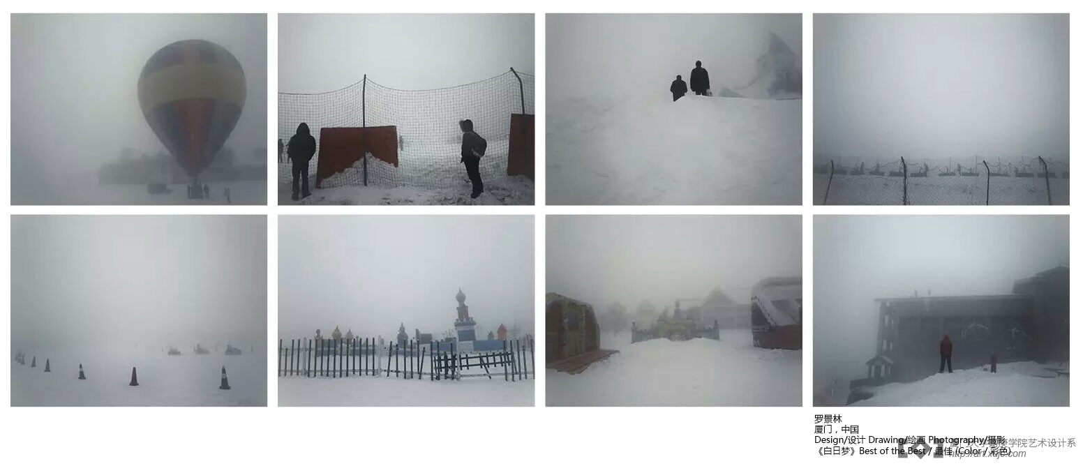 “作品《白日梦》拍摄在2015年一月的冬天,地点位于中国西南部四川省大邑县境内的西岭雪山中。冬日百无聊赖的日子里,人们存在于零下的温度,白茫茫的一片情景中制造出了一些偶然与可能性,他们有着荒诞、生动、梦幻的情节,让我记录了下来。”罗景林对作品介绍说。此外,罗景林同学的摄影作品《通天》和李旭达同学的《芙蓉湖》两件作品还获得了优秀作品奖。