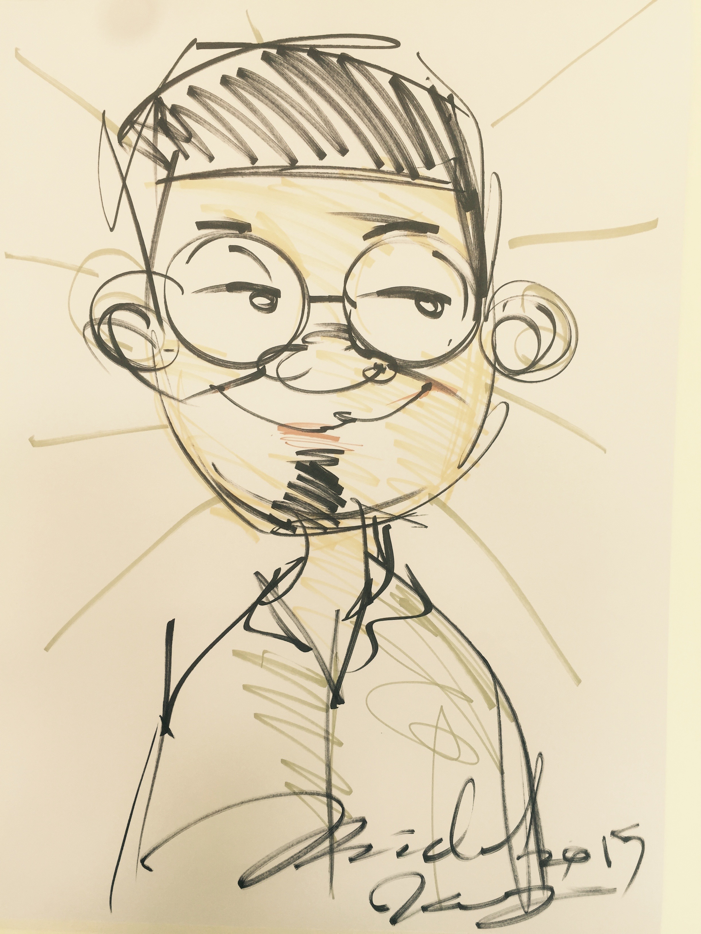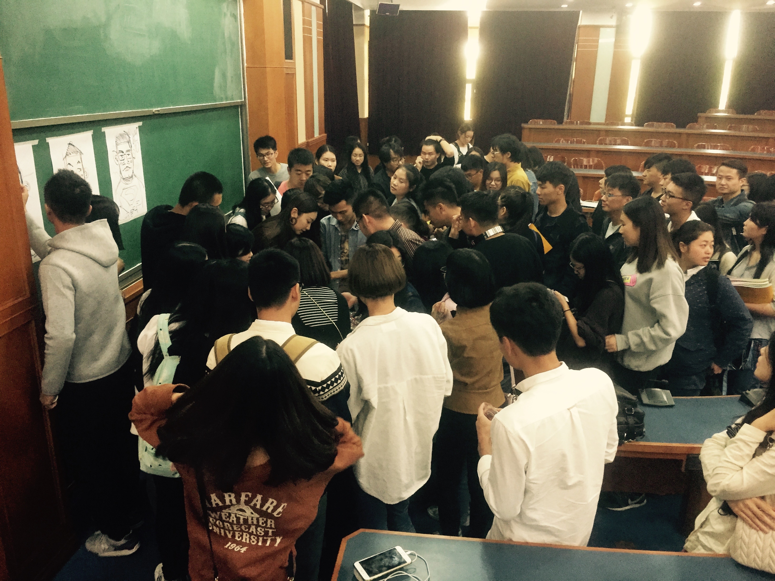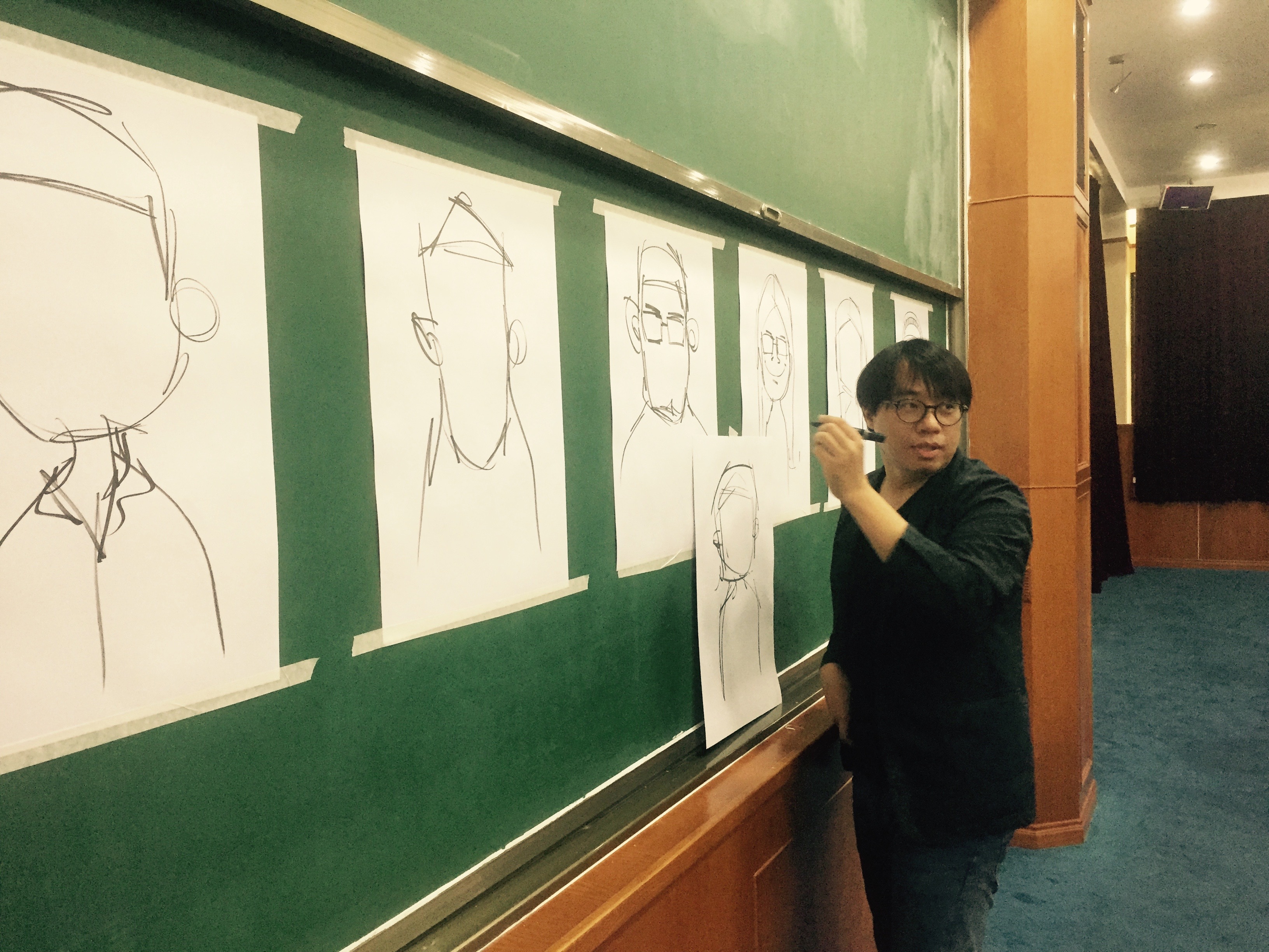 在讲座的尾声,邝教授在老师与同学们的强烈要求下,当场献艺,随机抽取现场的六位幸运的同学还有崔文铮老师(又是他…)作为模特,车轮作画,就是同时画七个人的漫画肖像,平均下来每幅画的创作时间还不到2分钟!顿时全场沸腾起来,每到一处点睛之笔,就引得场下一片呼声,让现场的老师与同学们都深深的感叹邝大师那扎实、深厚的专业功底。并表示意犹未尽,希望自己也能获得一张邝教授创作的肖像画。很幸运的是,邝教授本学期为艺设的同学开设了两门专业选修课《动漫品牌设计》和《脚本制作与视觉表达》,他答应同学们下周再来嘉庚上课时,还会为大家作画!