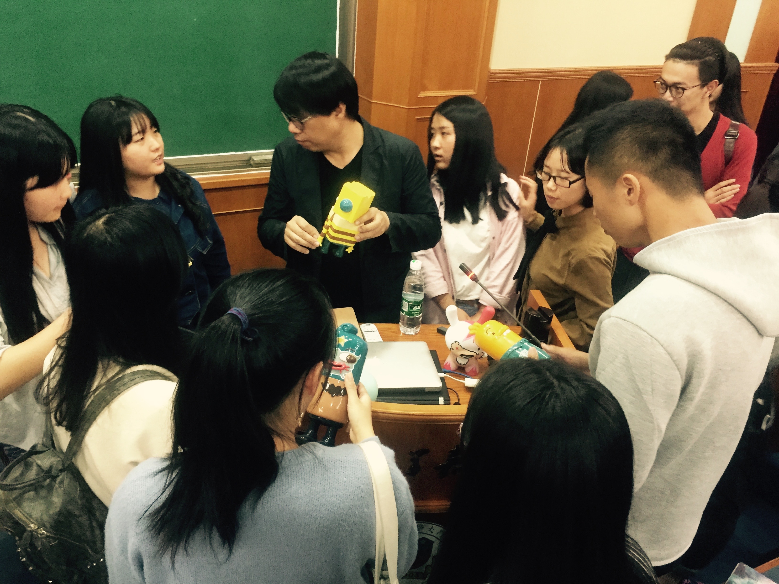 此次讲座,邝志文教授还带来了他正在创作的动画电影《积木合唱团》的玩偶设计与部分周边产品,从这些惟妙惟肖活泼可爱的玩偶身上可以感受到邝教授强烈的创作热情与极高的专业素养。在展示期间,邝教授还将自己创作的小产品作为礼物送给现场的每一位同学们。而当天最大的一个礼物,曾获IDA国际设计大奖产品组银奖的积木合唱团头盔,被数字媒体教研室主任崔文铮老师“抢走”,他说如果给了某位同学,其他人就再也看不到了。不如放在他的办公室,这样大家想看的时候可以随时来看。话音一落,全场一片嘘声。最终,他带着可爱的头盔与邝志文老师合影,就这样签收了这份大礼,引得全场同学羡慕不已。