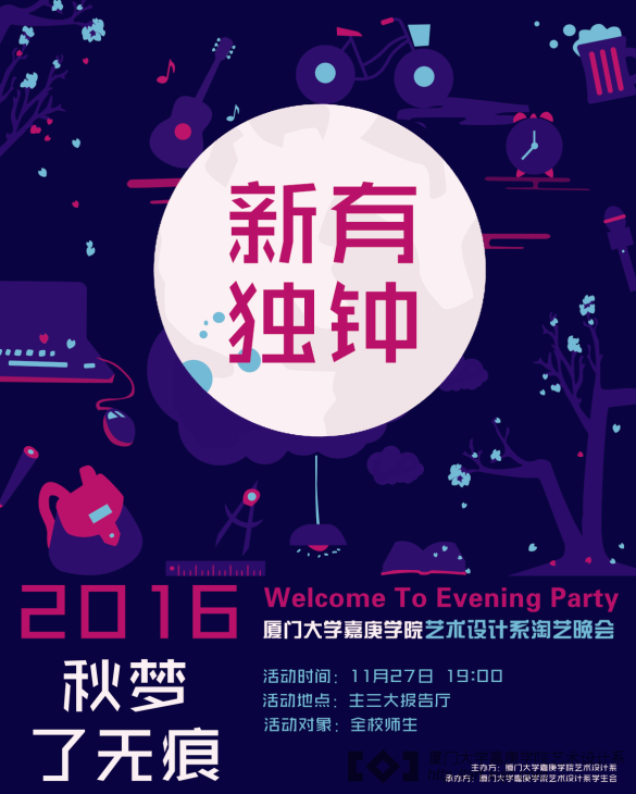 年年岁岁花相似,岁岁年年人不同。厦门大学嘉庚学院艺术设计系2016年淘艺晚会兹定于11月27日晚19:00在主3大报告厅倾情上演。诚挚邀请各位莅临观看,与我们共同渡过一个美好的夜晚。