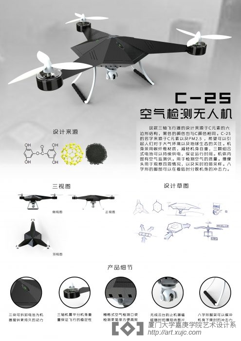 余泽希同学的作品《c-25空气检测无人机》是基于当前各地雾霾严重,检测手段单一不准确等问题所设计的。运用先进的无人机技术,让检测者自由的检测不同高度的污染物浓度和污染物种类。采集的样本也更精确细致,有助于后期的精确治理,提高雾霾治理的效率。并提到未来会多设计偏向科技的类的产品,也会继续学习深造并带动周边的同学一起参加比赛,扩大产品专业的影响力。