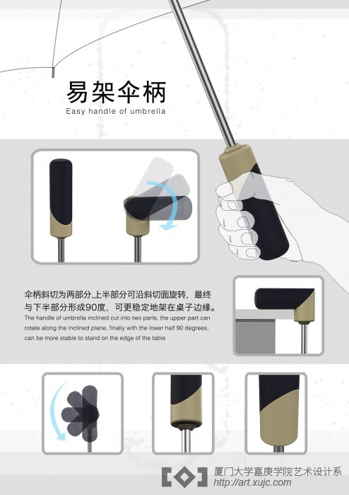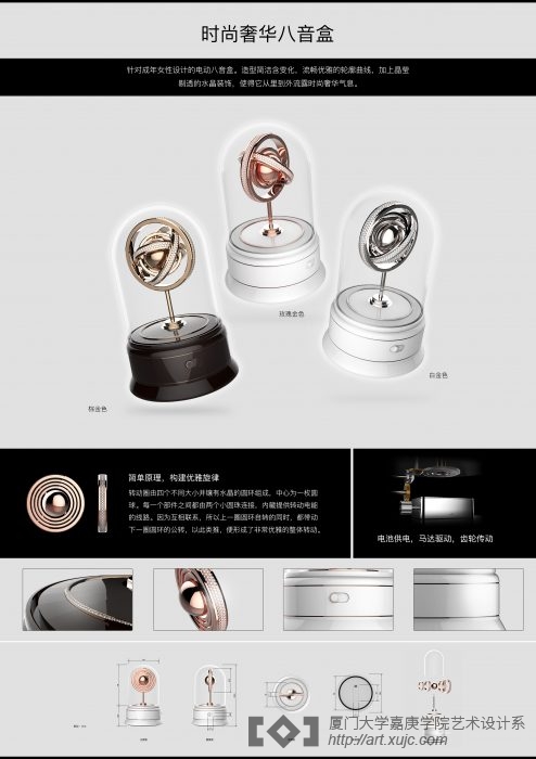 邢志远同学的作品《易架伞柄》是以解决生活问题为初衷。例如在生活中,折叠伞因为伞柄的接触面不够大很难放置在墙或桌子边缘。所以他将传统伞柄斜切为两部分,两部分可沿着斜切面旋转形成90度直角,如此一来便可轻松将雨伞架放在墙或桌子边缘。而《时尚奢华八音盒》则是针对女性设计的电动八音盒。内部有四个由水晶点缀的金属环,每个圆环不同角度的自转形成丰富的动态视觉感受。以经典八音盒为原型,加上现代化风格,再运用了金属、陶瓷和玻璃等不同材质相互搭配形成恰到好处的点缀,提升整体气质与细节。