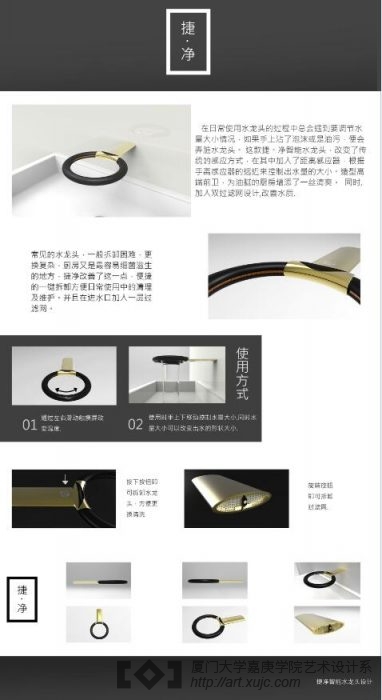 刘俊贤同学的作品《捷净智能水龙头》设计灵感来源于在手上沾满污垢或泡沫时,调节水量大小难免弄脏水龙头。这一款产品改变了传统的感应方式,使用了距离感应,根据手离感应器的距离控制出水量。此外,还增加了双过滤网设计,使水质得到进一步的改善,为油腻的厨房增添一丝清爽。