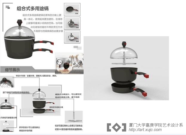 尉宜乔同学的作品《组合式多用途锅》解决了不同烹饪手法需要频繁换用不同工具的问题。组合式多用途锅使产品在原有的功能上更具一体化,使用上更加便利。螺旋式分离设计可以使锅体与蒸层分开,减小收纳空间,360°的循环蒸使得味道更加鲜美。