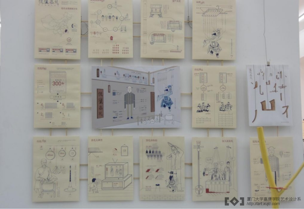 此次展览中,有几件颇具特色的作品。比如程鑫颖同学的作品——《侃侃嘉礼》。该作品以木偶为主题,通过独特的表现形式为我们展现“木偶文化”。以木偶为主题创作的初衷是希望更多人能够通过她的作品去深入了解木偶文化。程鑫颖同学与我们分享了她的创作历程,木偶文化小众又复杂,在整理作品背后的逻辑及设计图稿时遇到许多困难。但坚持下来,结果带给她意想不到的惊喜。