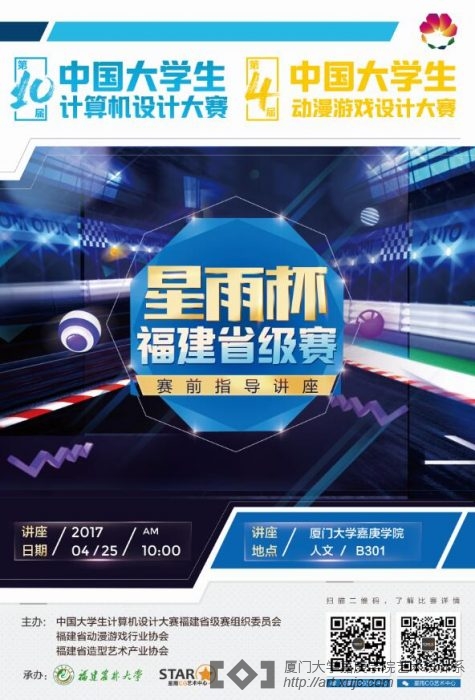 由中国大学生计算机设计大赛附件省级赛事组织委员会、福建省动漫游戏行业协会、福建省造型艺术产业协会联合举办2017(第10届)中国大学生计算机设计大赛、(第4届)中国大学生动漫游戏设计大赛。