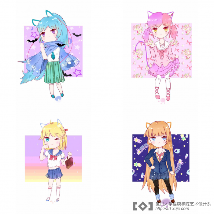 同学们运用专业技能,结合宿舍各成员的体态特征,设计了专属的成员Q版头像。囊萤3#112宿舍采用电脑手绘的方式,用四种鲜艳的颜色代表四人各自独特的性格特点,红色象征美艳大方,嫩绿则体现灵动俏皮。而囊萤3#117的参赛作品则是选用了日系美少女风格的卡通形象,动态多样化使得人物生动富有活力,最终获得了最佳Q版头像设计。