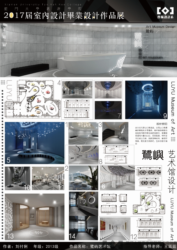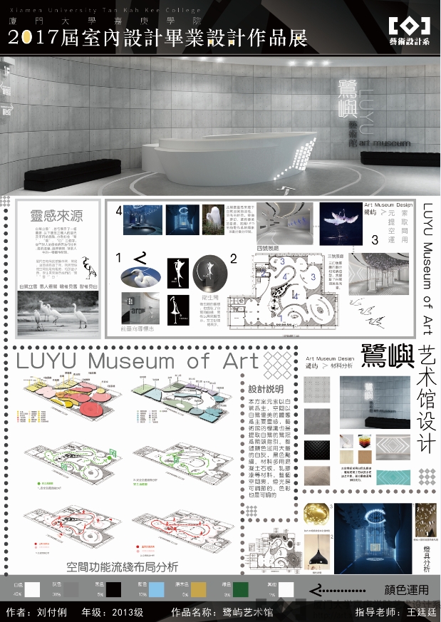 刘付俐的作品《鹭屿艺术馆室内设计》以厦门地区特有的白鹭为元素,灵感来自于“白鹭立雪,愚人看鹭,聪者见雪,智者见白”的首句“白鹭立雪”,采用大量灰白的色调,展现艺术馆室内环境灵动高雅的氛围。该作品能够在全国赛事上脱颖而出,拔得头筹,体现了我校艺术设计系环境设计专业多年来奠定的扎实的创意实践教学成效。