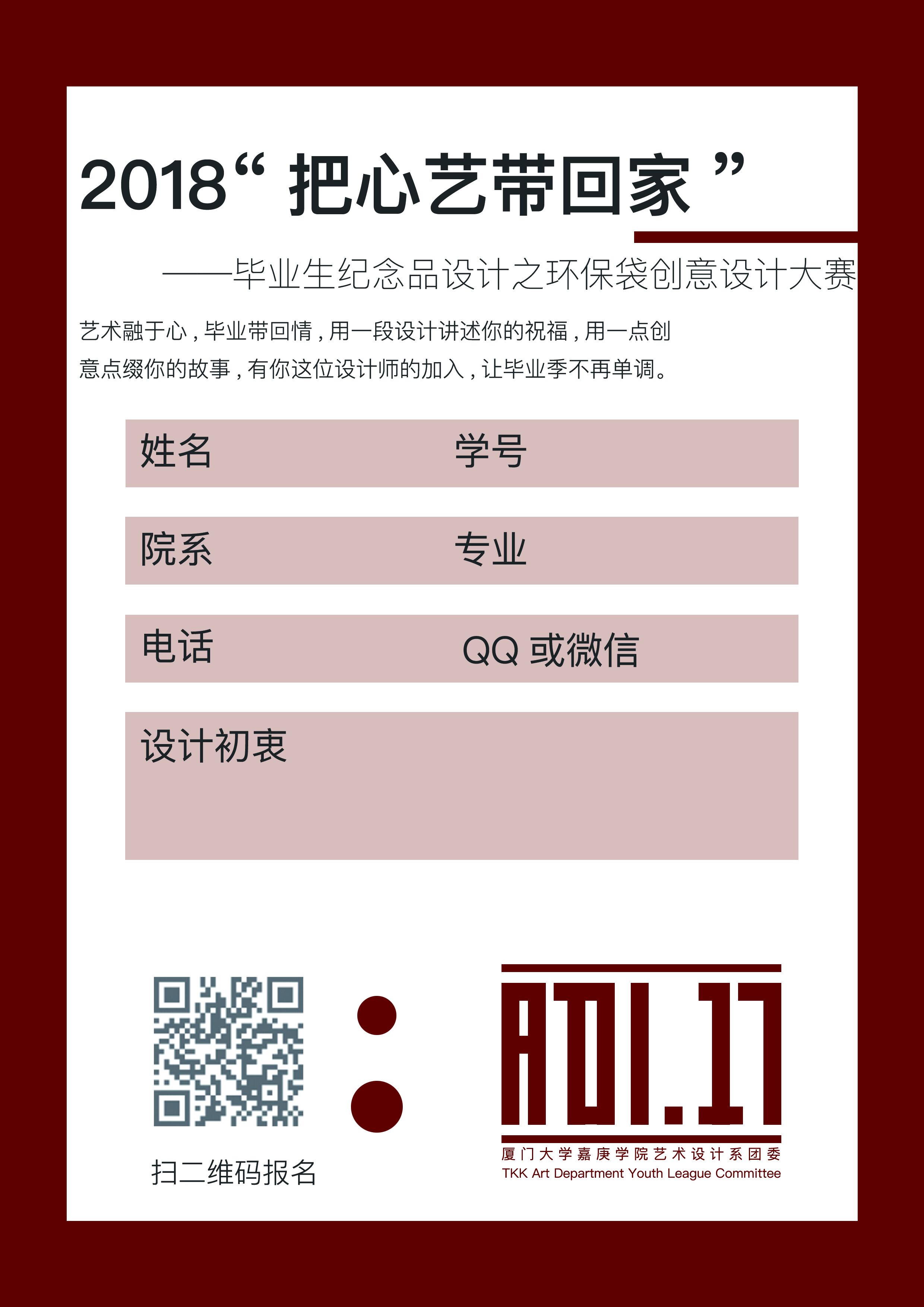1、本次大赛要求以环保袋为主体,进行环保袋样式创作,图案、插画、涂鸦、漫画等形式均可,作品表达内容积极向上,青春活力,体现嘉庚元素(如把心艺带回家、校友回嘉)以及艺设特色。
