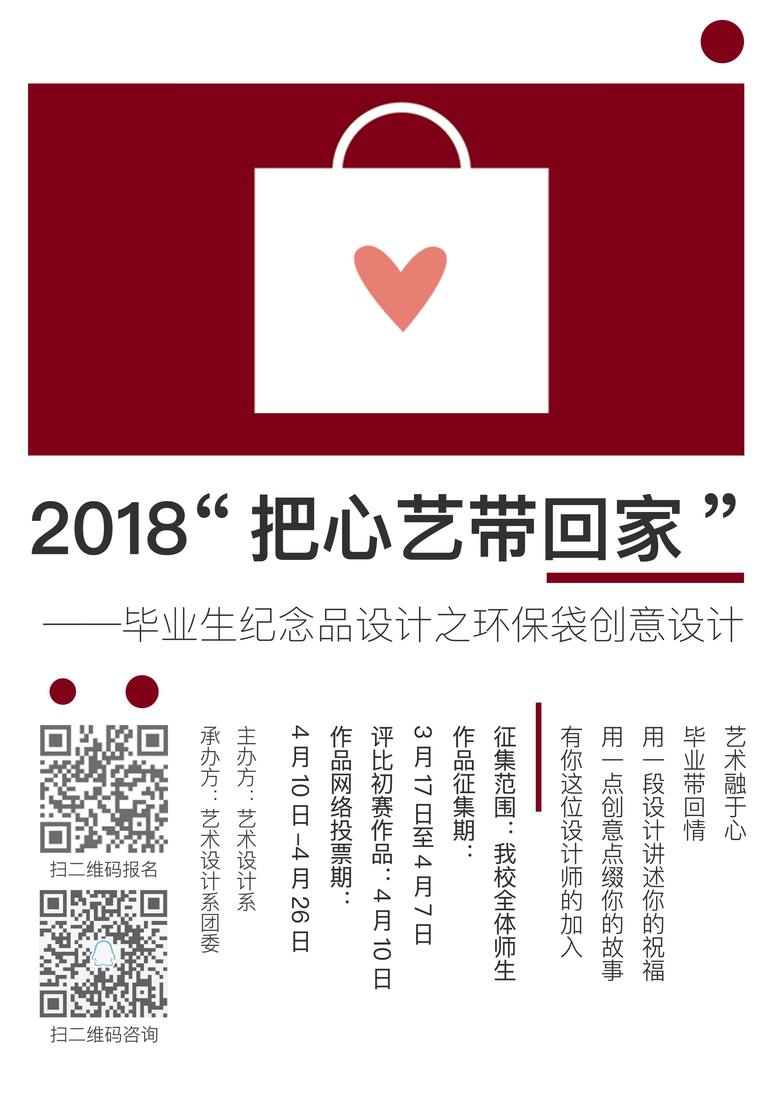 为了做好我校2018届毕业生的欢送工作,表达我系对毕业生的美好祝愿,使毕业生在离校之际再次感受到母校的温暖与关怀,同时推广和使用环保袋,积极响应政府“限塑令”的号召,我系团委特举办2018届毕业生纪念品(创意环保袋)设计征集大赛,本次比赛通过艺术创作的形式为我校热爱艺术设计、关注节能绿色环保的同学提供一个展现自我、表达的平台,藉以营造我校艺术文化氛围和节能环保氛围。现将有关事宜通知如下: