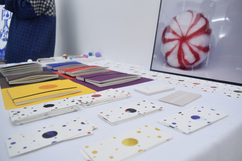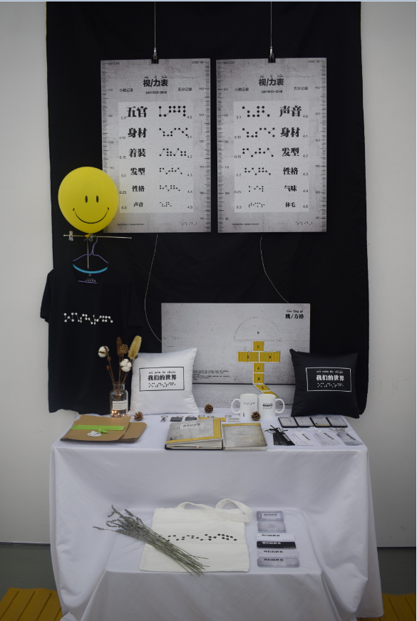 在本次展览中有王洁同学的作品格外引人关注,作品叫《我们的世界》,王洁同学表示,全球盲人约3600万,中国每年会出现新盲人大约45万。作品创作初衷是为了关爱视障者,了解视障者的世界。创作过程中,她深入厦门视障协会,与视障者一同生活,并采访协会工作人员,从不同角度去了解这一个群体。创作成果是一系列视障者感官物品及两本书。