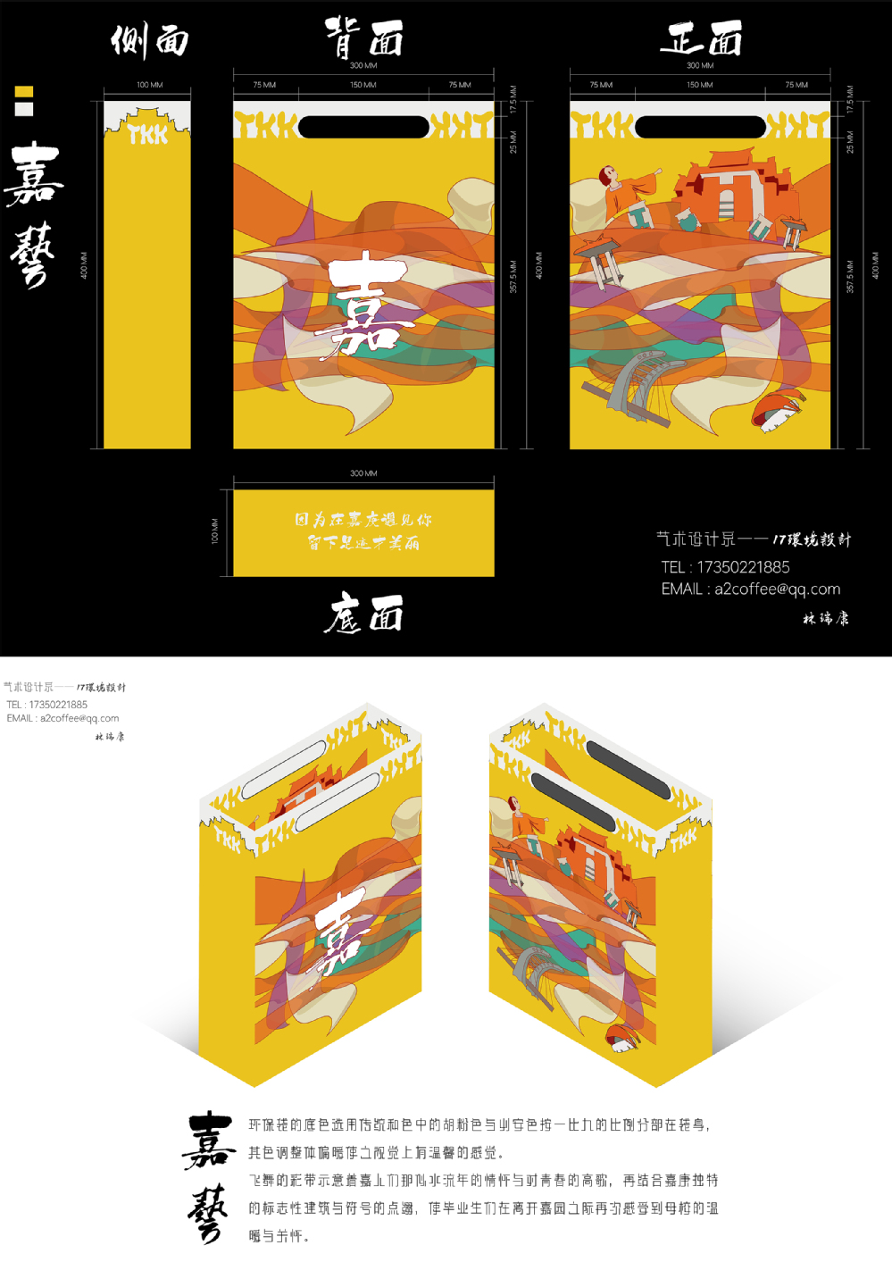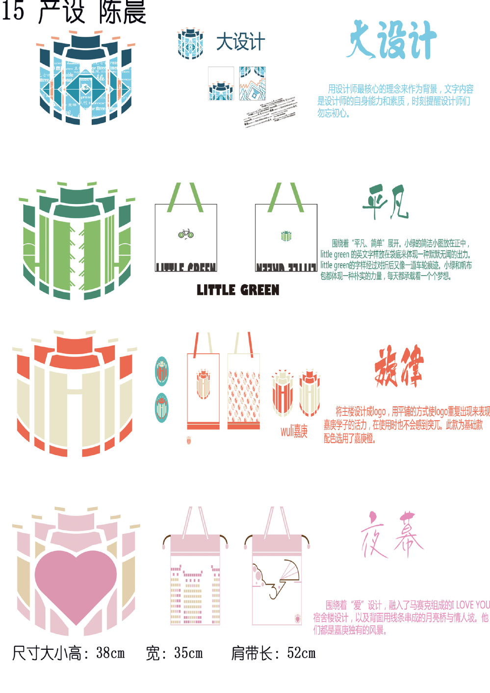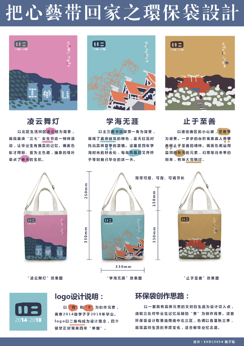 本次纪念品设计大赛以“环保袋”作为创作载体,参赛同学发挥自身专业优势和创意,巧妙地把“嘉”的元素和“环保”理念融合在一起。从嘉园里无处不在的“小绿”自行车、充满传说的月亮桥、到凌云楼的“三七”女生节亮灯仪式以及具有嘉庚特色的主楼群等,都是设计者们眼中希望让毕业的学长学姐带走的永恒回忆。