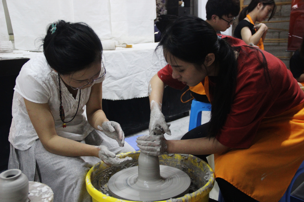 在实践过程中,让众多同学感到困难的是拉坯机不好控制,手劲不够,泥坯重心难以捕捉成为同学们创作实践的障碍,好在有老师和助教的帮助,同学们越挫越勇,互帮互助,不停地练习直至成功,这可能就是陶艺实践活动想要告诉我们的道理。