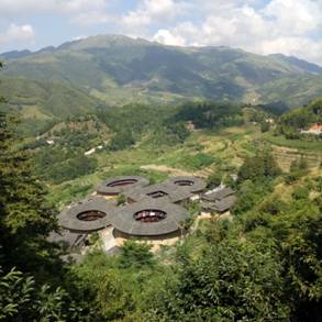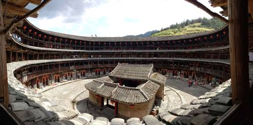 7月11日上午,导游带队一同参观了田螺坑土楼,由一座方形土楼一座椭圆形土楼以及三座圆形土楼组成的土楼群落被戏称为“四菜一汤”。