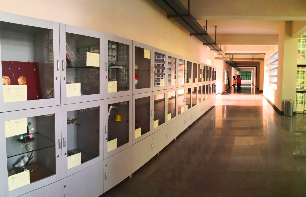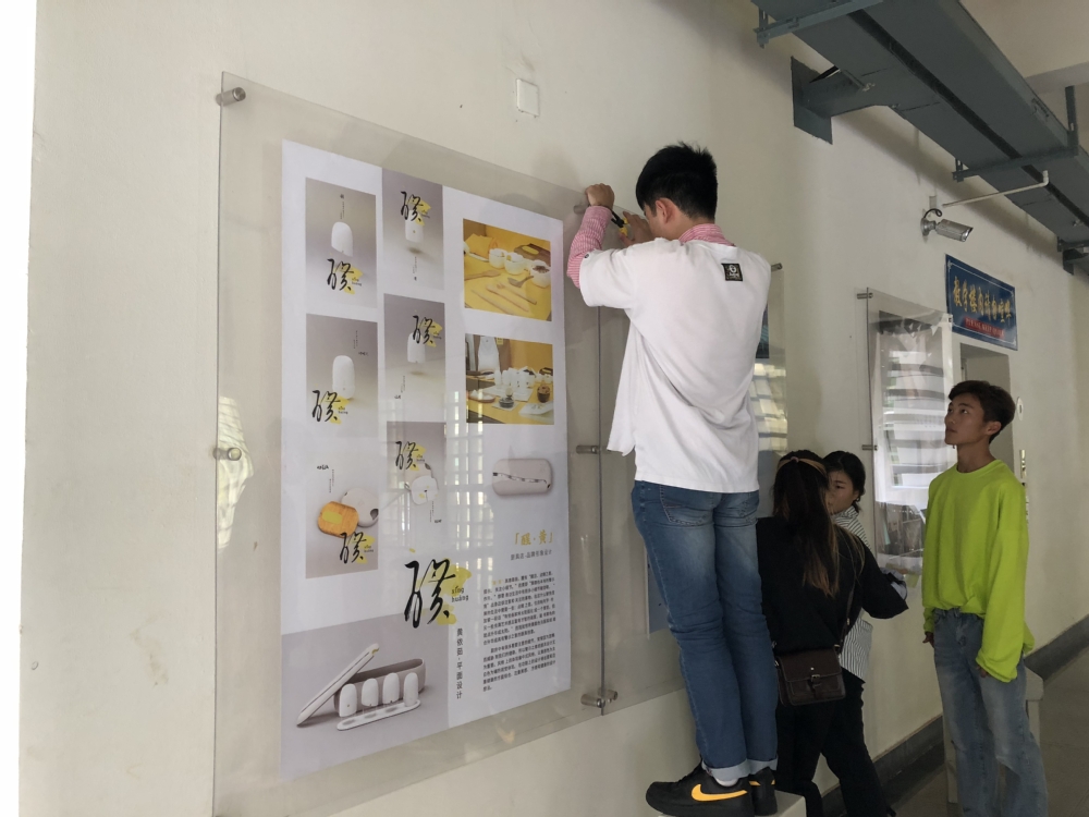 人文楼各层走廊墙上,分布有亚克力展板,裱出了各个专业的优秀设计作品。各楼层的展示柜中,展出了动画和产品设计专业同学的优秀模型作品。