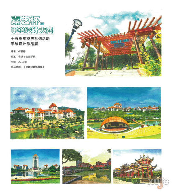 由2017届会计与金融学院校友柯毅婷设计的《你嘉我嘉筑情缘》,以嘉庚风格建筑特色为线索,用水彩技法描绘嘉庚学院、集美大学、厦门大学及嘉庚公园的代表建筑,旨在弘扬嘉庚先生的奉献精神,献礼嘉庚先生诞辰,恭贺母校校庆。