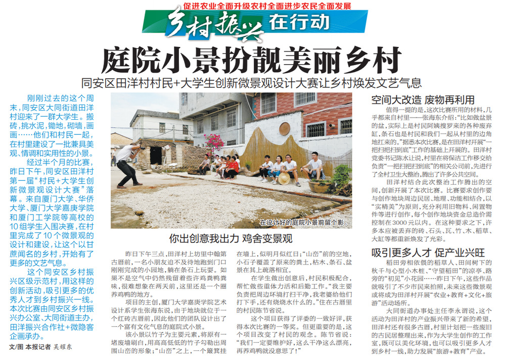 10月20日下午三点,厦门田洋村”村民+大学生创新微景观设计大赛“落幕。来自各高校的十组设计也已竣工,我校师生的“蔗峦景寂”设计勇夺桂冠。