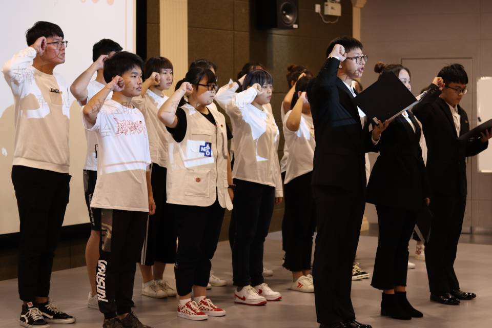 随后,各部门部长分别上台演讲,对自己部门的现况进行介绍说明。伴随着部员们利用课余时间,精心准备的介绍短片,在场嘉宾纷纷忍俊不禁,大会充满了快活的空气。而介绍之余,由各部门部员齐力朗诵的诗歌、四位可爱的部员献唱歌曲《倔强》,也获得了一致好评,夺得了在场“观众”们的阵阵掌声。青工部部长们更是带领全体部员上台宣誓,展现了作为党之后备军的团委应有的优秀面貌。