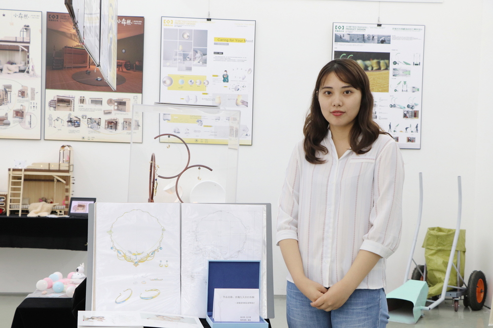 任子琦同学设计的“翼翔九天一归梧桐”是以梧桐为主题的珠宝设计,“我设计这套珠宝是希望珠宝可以一代一代传承,灵感来源于凤栖梧桐。凤凰从天上下来,落在梧桐树上,梧桐是凤凰的家。这套珠宝的寓意,母亲就是女儿的家,女儿出嫁时叫凤栖梧桐,从梧桐飞走的时候称为一翔九天,所以我的作品名称叫“翼翔九天一归梧桐”。
