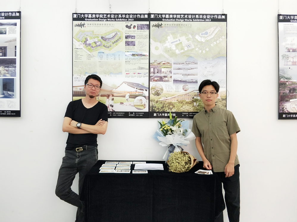 陈子阳同学设计的项目是“山城计——铁峰岩旅游度假酒店”,位于泉州安溪,该项目是为了给政府大力支持开发的铁峰岩旅游风景区提供相对完整的功能配套服务设施,同时探索传统酒店功能和环境的革新,通过酒店来吸引游客前来旅游,带动经济发展。项目基地依山傍水,有着得天独厚的自然环境,创作的设计灵感来源于中国山水画,并提取闽南燕尾脊元素。问及设计中遇到的困难和解决方法时他说,“一是设计方向的确定。最早我的设计方向偏旅游开发规划,但是最后发现我的想法范围广、内容杂、目标不清晰,最后在导师叶茂乐老师意见下明确了最终设计的目标和方向;二是我的想法难以实现,专业软件技能暂且达不到最终出图效果。”