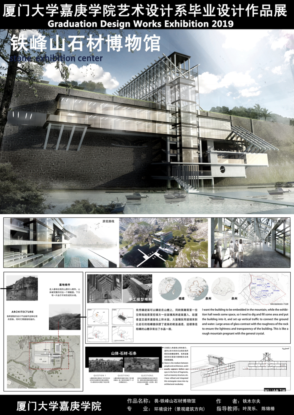 铁木尔夫同学的作品名为“铁峰山石材博物馆”,基地位于安溪县铁峰山内的一处废弃矿坑内,调研过程中发现,矿坑特殊的基地条件有一定的挑战,最初设想在岩壁上挖空,安装通透的玻璃与粗旷的岩石形成对比,这样既可以让整个建筑与基地有更多的联系,也可以使得整个建筑在岩壁上显得更加轻盈,但基地的地质条件不允许将岩壁掏空,最终他听取了老师给予的解决方案,毕业设计得以顺利完成。