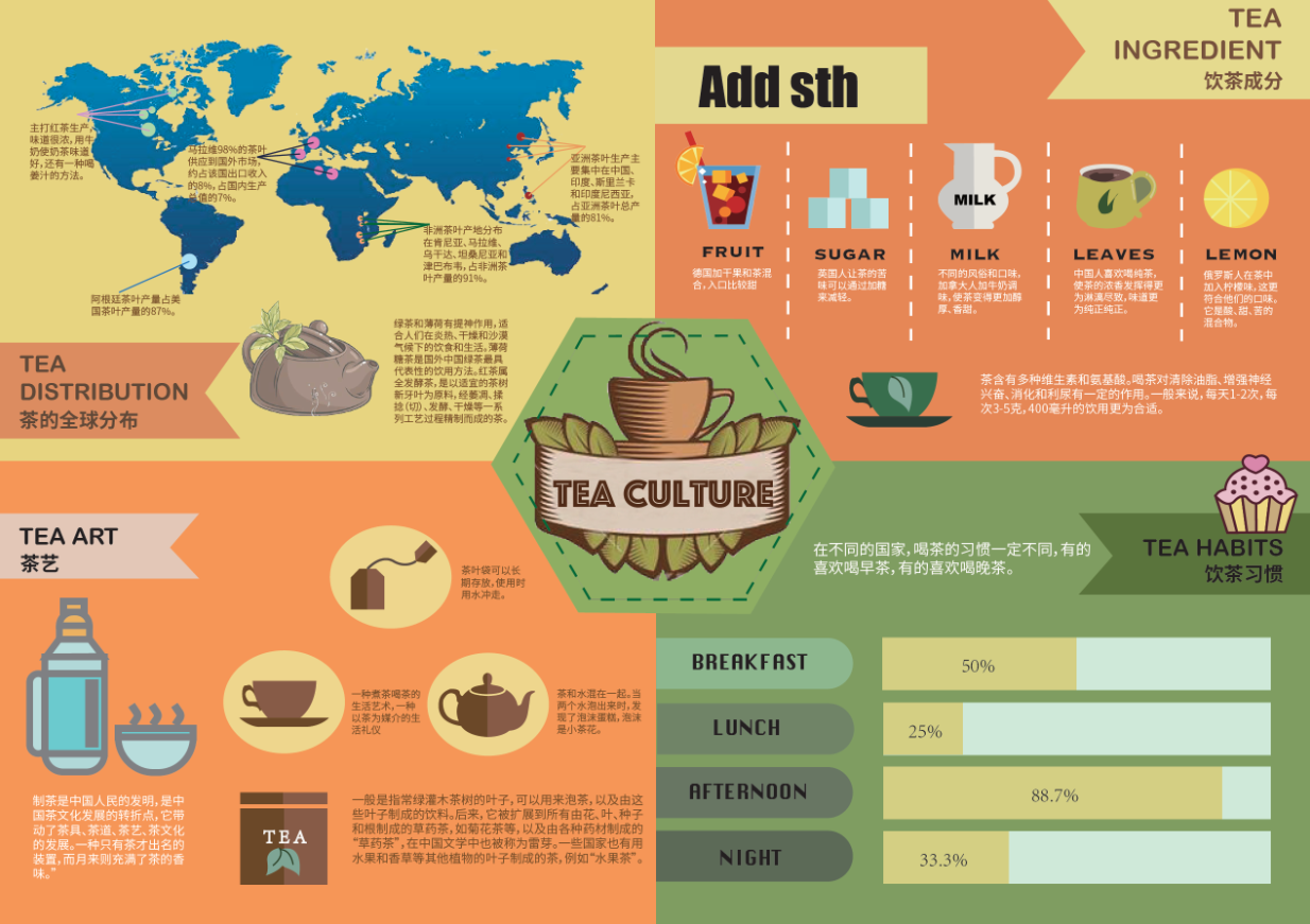 “发现问题→分析问题→收集资料→分析资料→图形表现” 的创作过程,适用于数字媒体设计甚至是任何一种设计形式。在表现形式上,尽管选题不同,各位同学基本都采用了“手绘+二维软件制图+排版”的形式,不但巩固了大一一学年以来我专业方向的二维设计、图形设计、字体版式设计这三门课程的学习成果,而且还初步了解了信息图形设计的基本方法。