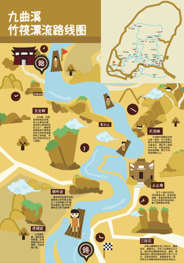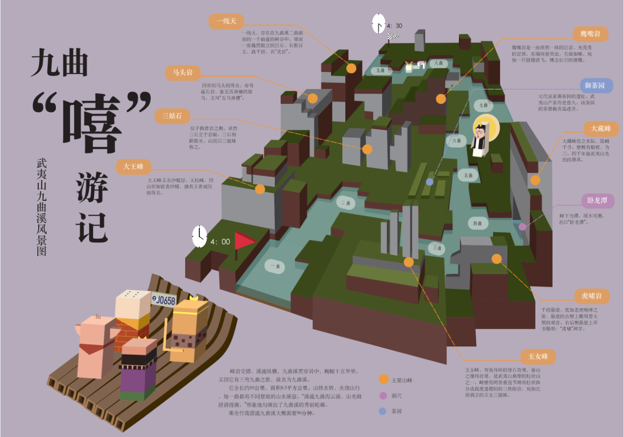 七月一日至十二日,艺术设计系数字媒体专业2018级的25位同学在教研室老师的带领下,前往武夷山景区及厦门市相关设计公司进行了采风和调研活动。实践周前半段为期一周的武夷山景区实践期间,我们游历了武夷山景区内九曲溪、崇阳溪、天游峰、虎啸岩、水帘洞等景点以及景区外围的下梅古民居、茶博园、滨溪漫游道等景点。参观景点并不是实践周的本意,在参观中发现问题,并以设计的方式解决问题才是实践周的目的。