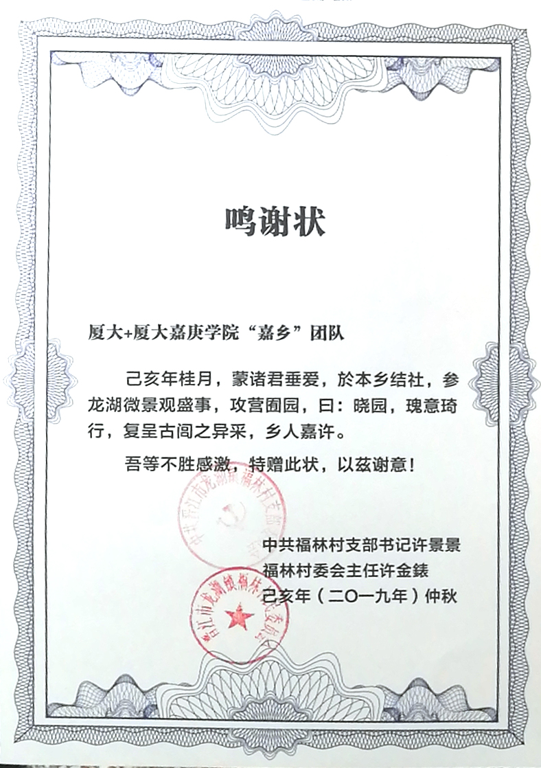 近日,通过专家的严格现场评审,第三届海峡两岸大学生乡村营造夏令营决出名次。厦门大学嘉庚学院“嘉乡”团队在本次比赛中改造的龙湖镇福林村端园东地块,从82个高校团队中突围荣获一等奖。“嘉乡”团队全名为嘉艺乡建团队,团队指导老师叶茂乐和陈锦椿,以及5名学生均来自厦门大学嘉庚学院艺术设计系。