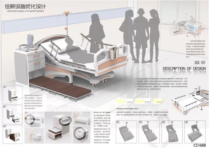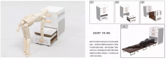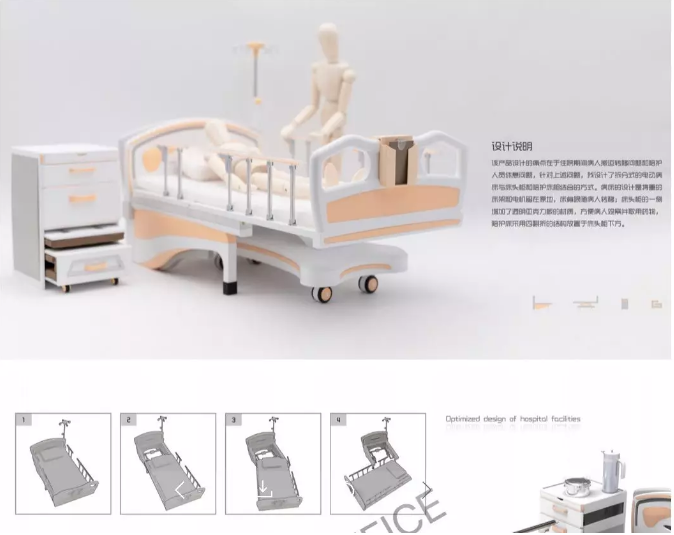 这些问题被江同学仔细收集分析。江同学通过观察发现,病床的床头柜并没有充分利用,浪费许多空间,便将两者结合,设计出《优+ 住院设施优化设计》,既可以充分利用床头柜空间也可以让陪护人员有地方休息。