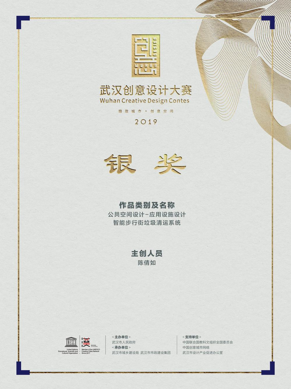 武汉创意设计大赛是由武汉市人民政府主办,武汉市城乡建设局和武汉市市政建设集团联合承办的专业设计竞赛。面向全球招收以“精致城市 创意空间”为主题的设计方案。本次竞赛奖金高达73万元,分四个主题展开,艺术设计系产品设计专业2015级学子陈倩如同学以作品《步行街智能垃圾清运系统》斩获公共空间设计——应用设施组银奖,获得奖金2万元。