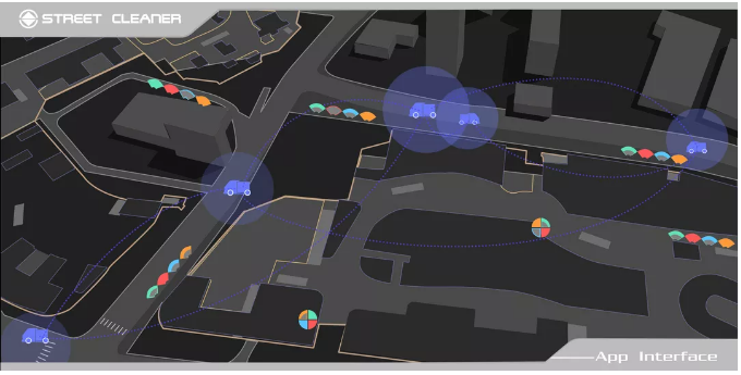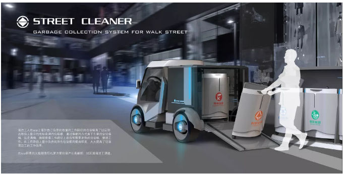 经过与老师的一番前瞻性探讨,陈同学开始思考解决方案,于是有了如下的概念设计方案。该设计建立在中国垃圾分类正在实施和推广的大环境下,针对部分步行街垃圾回收滞后的问题进行概念设计。