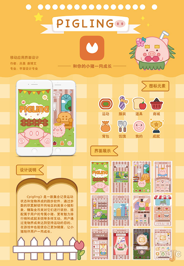 《Pigling 移动应用界面设计》是一款集合记录运动状态和宠物养成的跑步软件。该软件通过步数的积累,解锁不同地区的美食小猪形象,赚取金币来对它们进行装扮,搭配属于用户的专属小猪;更有魅力排行榜和成就系统等多样互动。用户通过宠物养成来达到坚持运动的目的,在游戏中使自己更加健康。
