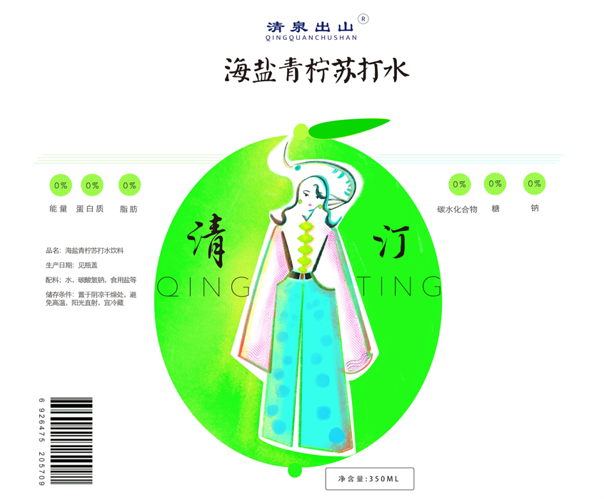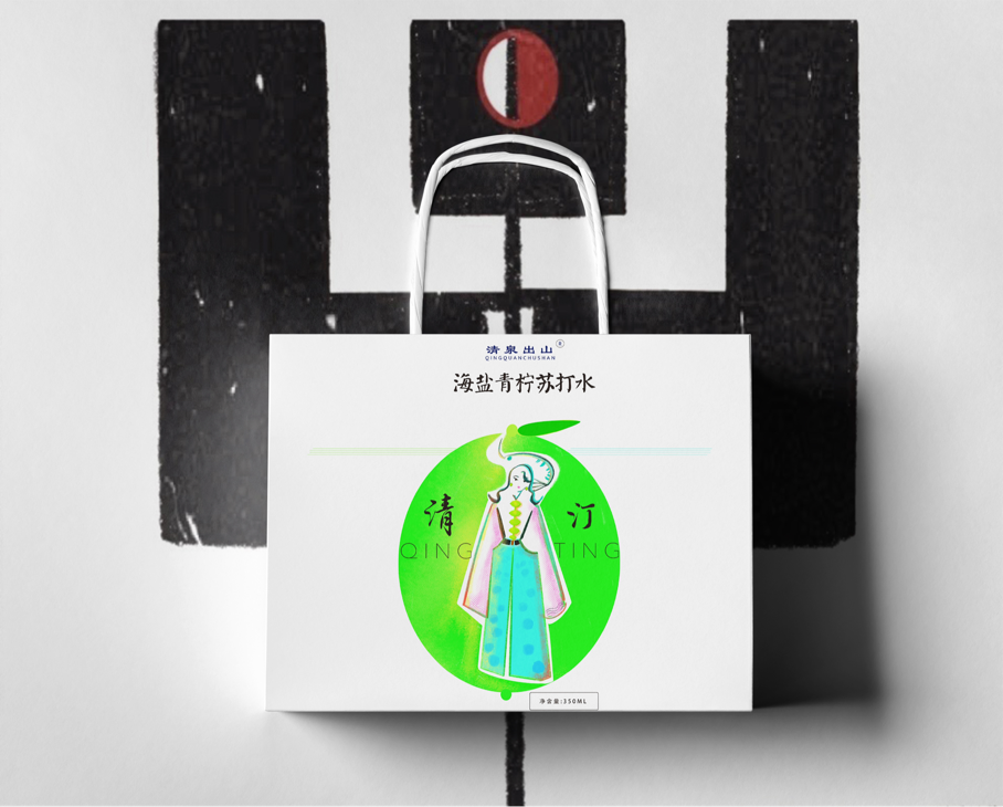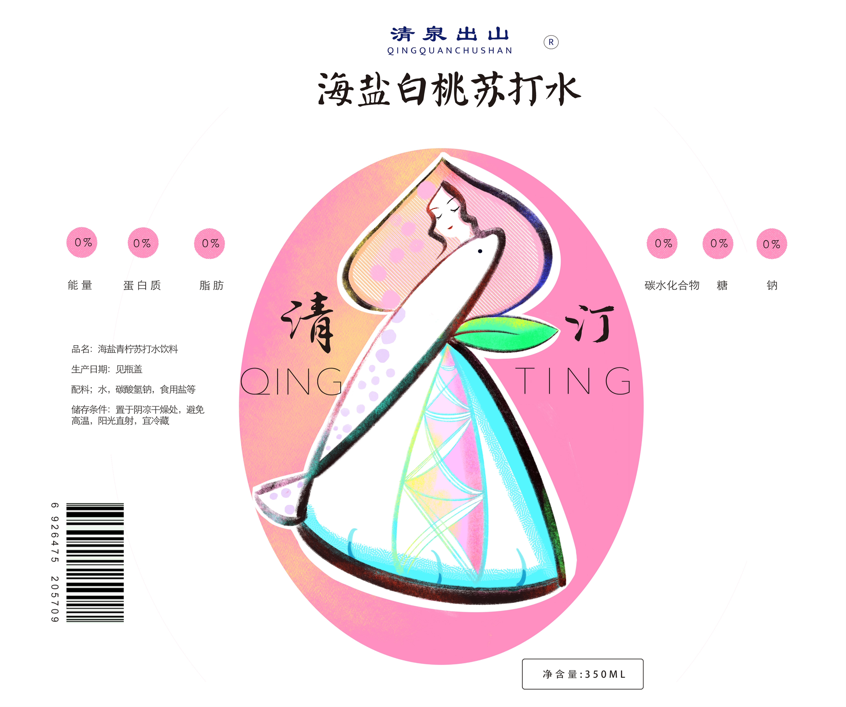 作品简介:此包装将青柠、白桃和气泡、海洋动物与人物结合进行插图绘制,使用绿色和粉色为主色调,表现苏打水的清新爽口又使包装更加美观。