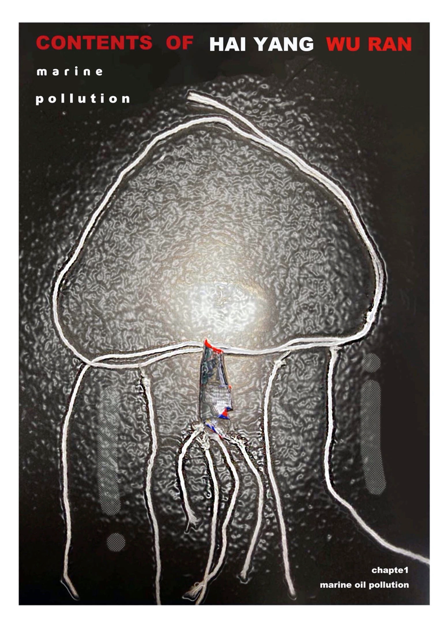 第一幅表现石油污染,毛线及食品包装袋构成水母的形状,黑色为底代表石油污染,水母陷入背景的状态表现石油污染对海洋生物的伤害。