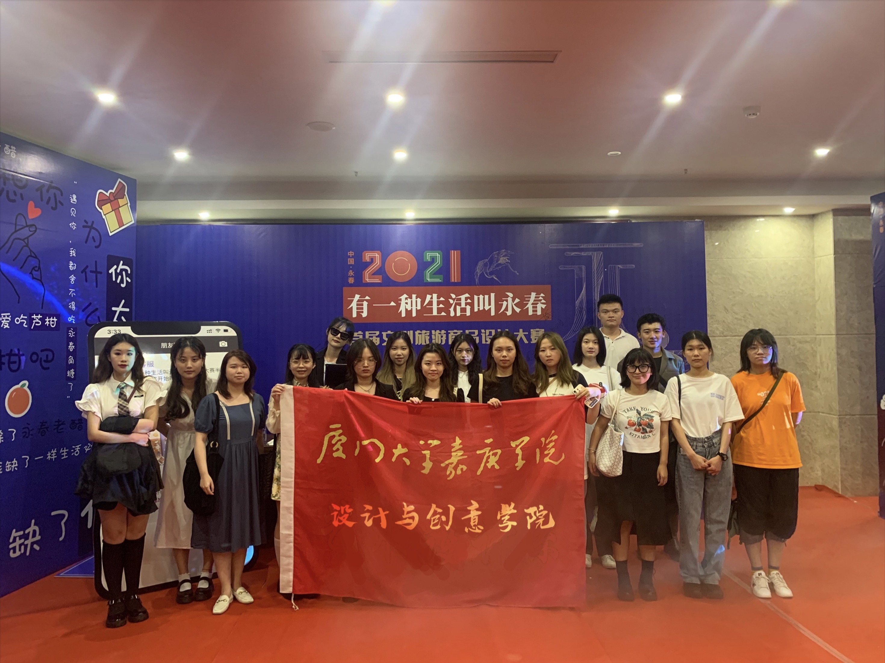 为进一步深入挖掘永春历史文化底蕴,以文化旅游新亮点助推“有一种生活叫永春”城市品牌建设,6月9日,由永春县委县政府主办、永春文化体育和旅游局以及永春县人社局等相关单位协办的“有一种生活叫永春”首届文创旅游商品设计大赛半总决赛暨颁奖典礼在永春北溪文苑举行,我院18位同学作品入围半决赛,由丁寰老师带队前往参赛。