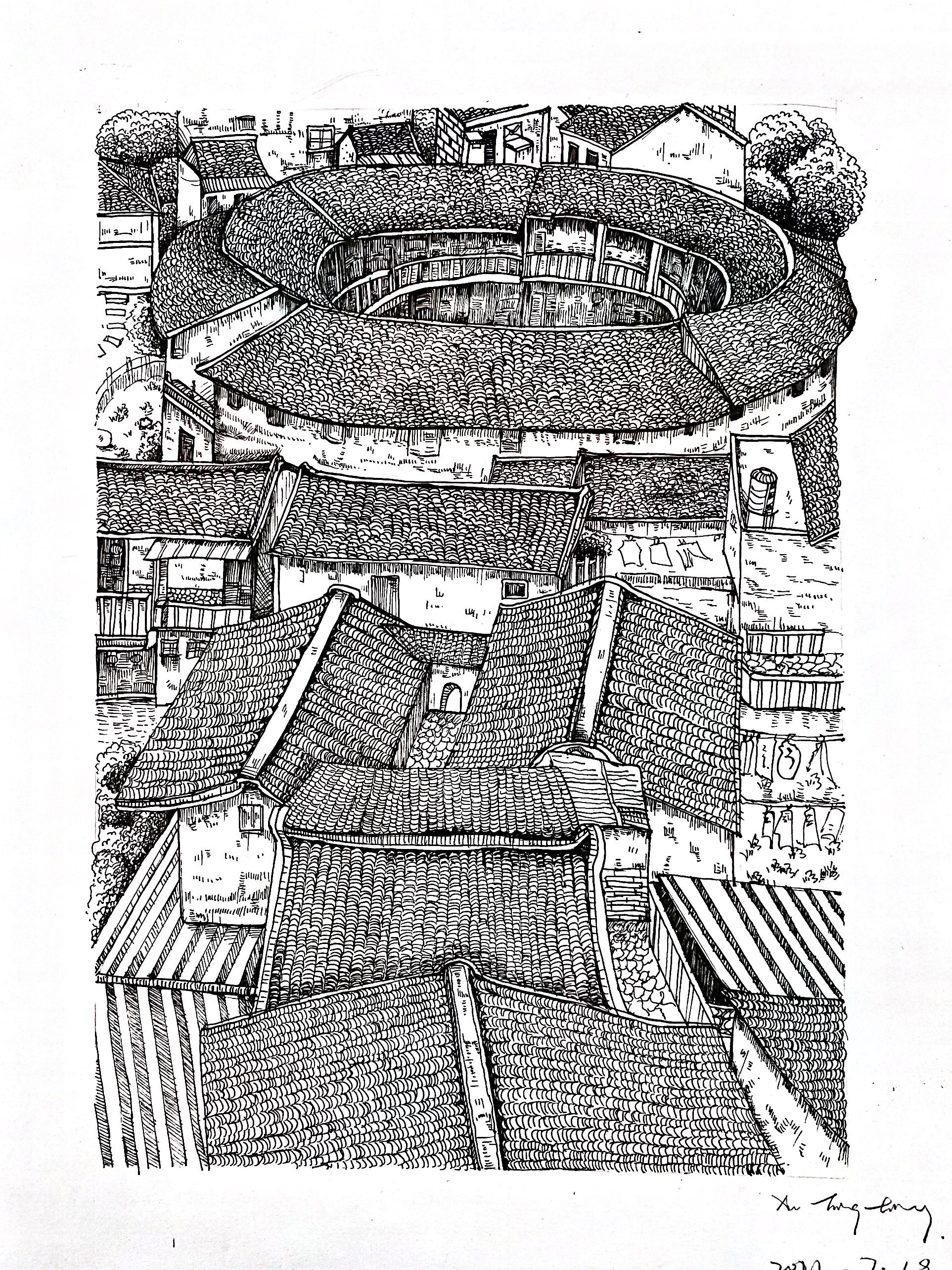 写生考察的最后几天,师生们考察了初溪土楼群、永定土楼和龙崆洞。虽能在网络和书籍上已了解了关于福建土楼的介绍,身临其境还是给大家不少震撼,对福建传统民居建筑的了解更为深刻。
