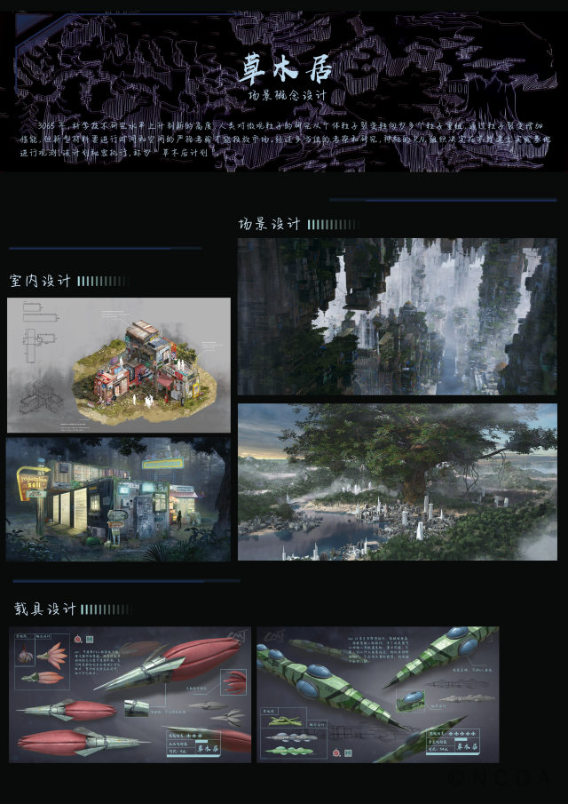 国赛二等奖获奖作品《草木居》由杜劲老师指导,创作者王胜兰。这是一件关于未来世界的场景设计作品。人类对微观粒子的研究从个体粒子裂变转向为多个粒子重组,通过粒子裂变增加性能,但新型材料要进行时间和空间的严格考验才能投放市场。经过多方位的考察和研究,神秘的R.N.组织决定在木崖建立实验基地进行观测。该计划秘密执行,称为“草木居计划”。 《草木居》对该背景进行场景设计以及载具设计,构建出不一样的世界。
